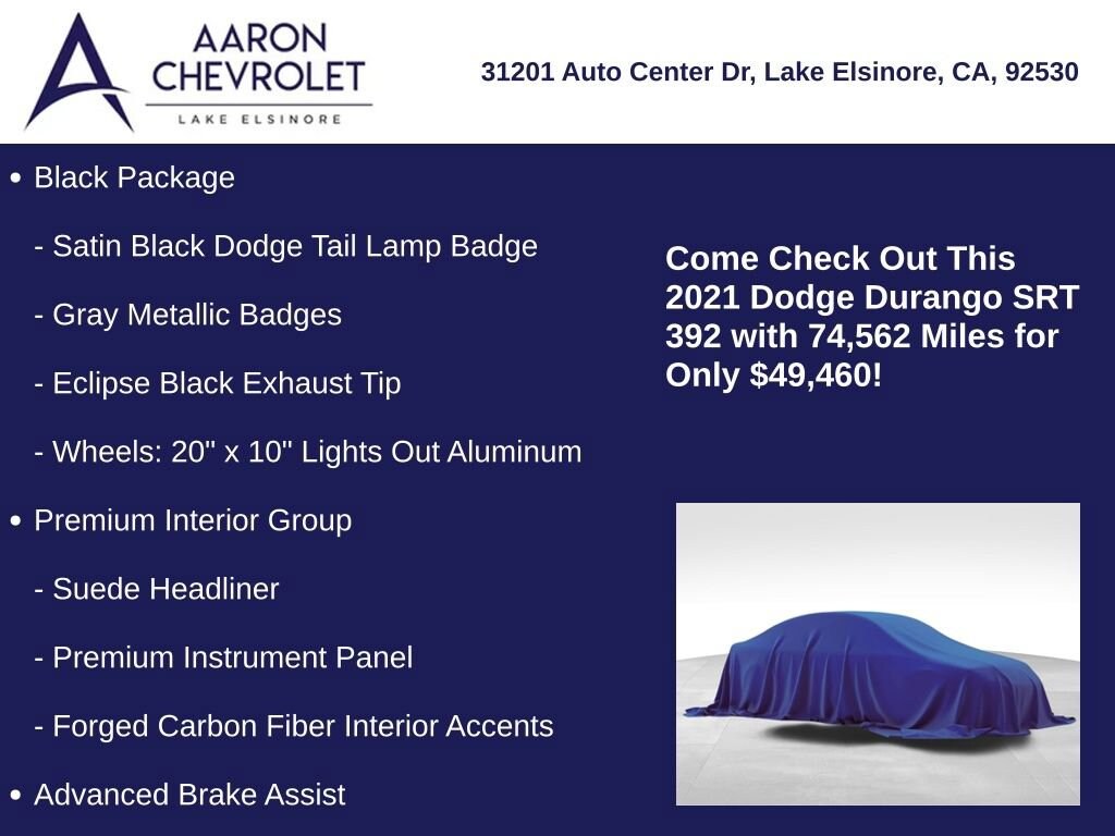 Elevate your driving experience with this exceptional 2021 Dodge Durango SRT 392. This powerful SUV boasts a commanding presence on the road, thanks to its bold, black exterior and striking design. Beneath the hood, the SRT HEMI 6.4L V8 engine delivers exhilarating performance, with 8-speed automatic transmission and all-wheel drive for maximum control.Customized with a range of premium features, this Durango SRT 392 is tailored to your needs:- Technology Group: Includes Adaptive Cruise Control, Advanced Brake Assist, Forward Collision Warning, and Lane Departure Warning- Black Package: Adds sleek, blacked-out accents for a menacing look- Premium Interior Group: Elevates the cabin with Suede headliner, Forged Carbon Fiber accents, and a Premium Instrument Panel- Red Seat Belts for a touch of sportiness- Power Sunroof to let in natural lightThe attention to detail continues throughout, with a stunning Demonic Red and Black high-performance Laguna leather interior, 19 Harman Kardon amplified speakers, and a 825-watt subwoofer for an unparalleled audio experience. Blind Spot and Cross Path Detection keep you aware of your surroundings, while the advanced navigation system with TomTom technology ensures you always reach your destination with confidence.This Durango SRT 392 is more than just a powerful SUV it's a statement of refined style and uncompromising capability. Whether navigating the city streets or tackling the open road, this vehicle is designed to elevate your driving experience to new heights.We invite you to experience the thrill of this exceptional 2021 Dodge Durango SRT 392 for yourself. Contact us today to schedule a test drive and discover the true meaning of driving passion.