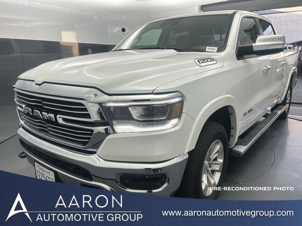 2019 Ram 1500 Laramie Crew Cab 4x4 with Laramie Level 1 Equipment Group, Customer Preferred Package 28H, Advanced Safety Group, Protection Group, Bed Utility Group, and Ivory Tri-Coat Paint plus 5.7L HEMI eTorque 4x4 power. Carfax shows Good Reliability and 23 service records. Just under 83,000 miles.