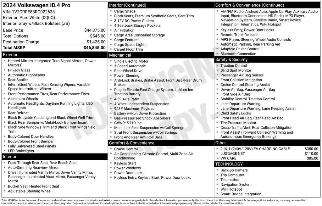 Beyond these standout features, the ID.4 Pro is equipped with a wealth of premium amenities that will elevate your driving experience. Enjoy the convenience of the Navigation System, the clarity of the 7 Speakers, and the comfort of the Heated Front Seats. Stay connected with the Radio data system and the Radio: Discover Pro Max w/Touchscreen Navigation, while the Automatic temperature control and Rear window defroster keep you comfortable in any weather.